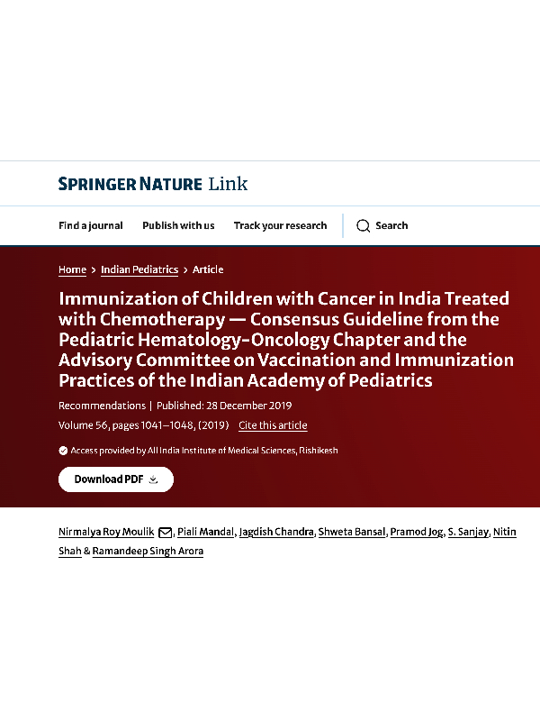 Immunization of Children with Cancer in India Treated with Chemotherapy – Consensus Guideline from the Pediatric Hematology- Oncology Chapter and the Advisory Committee on Vaccination and Immunization Practices of the Indian Academy of Pediatrics.